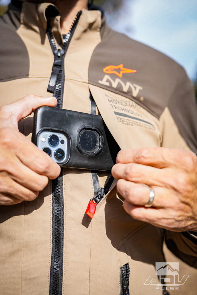 Side pockets on the jacket have a unique reverse-opening design that aids quick access to items and helps prevent things from flying out if you forget to zip them up. Inside, a waterproof breast pocket can be used to keep your phone dry and a large mesh pocket is convenient for storing gloves or sunglasses when you’re exploring off the bike. On the pants there are just two zippered side pockets, which are spacious and they open in a slightly backward angle as well.