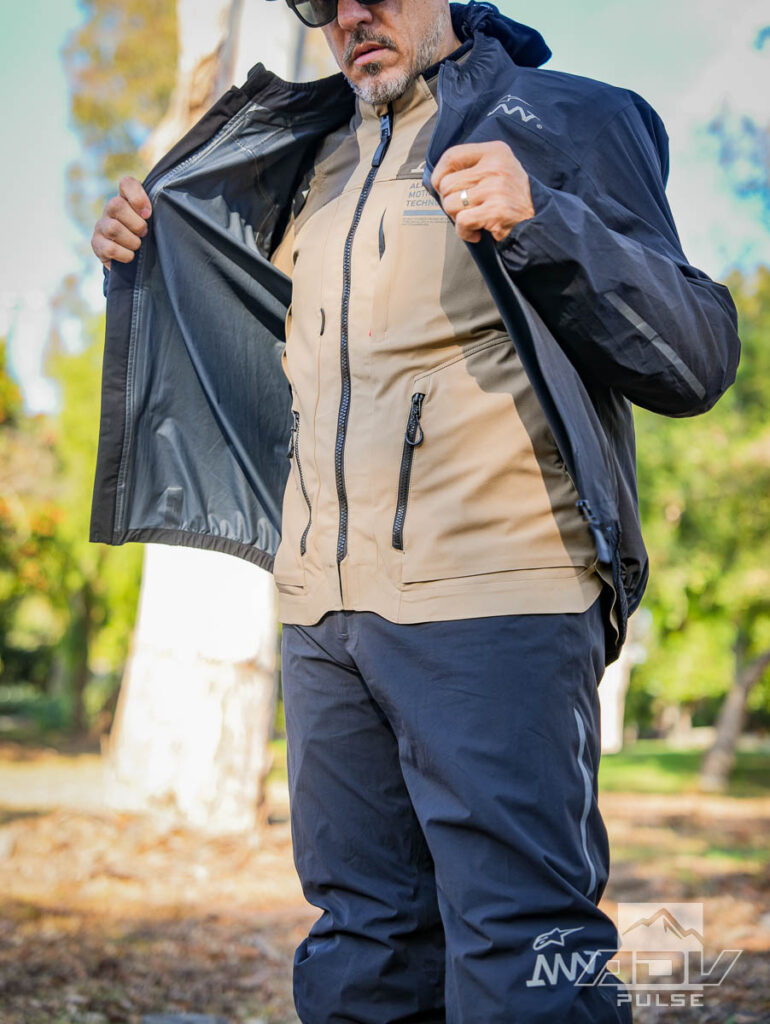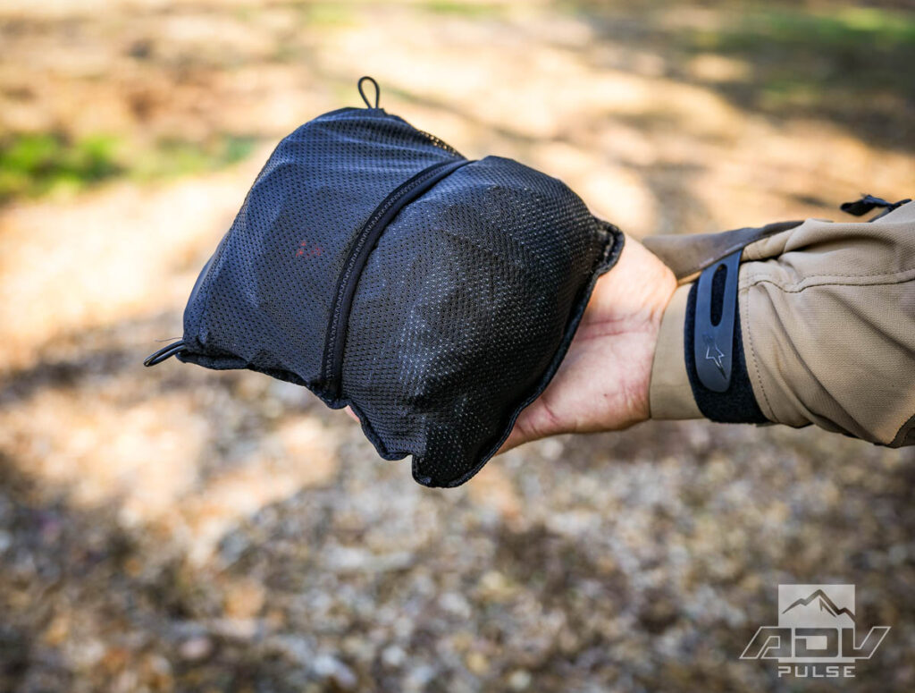 While I did test using the liners underneath, I found it more convenient to go over the top. That way you can wait to put them on until you really need them and when the weather clears, you can quickly remove them. It also keeps the rain from building up in the non-waterproof shell material. If you are doing more enduro-style riding, you can store the liners in the jacket’s rear pouch and you don’t even notice them there. You can also stuff them into their own attached stuff sacks and make little puffy pouches out of them, which are easy to find room for in your luggage.