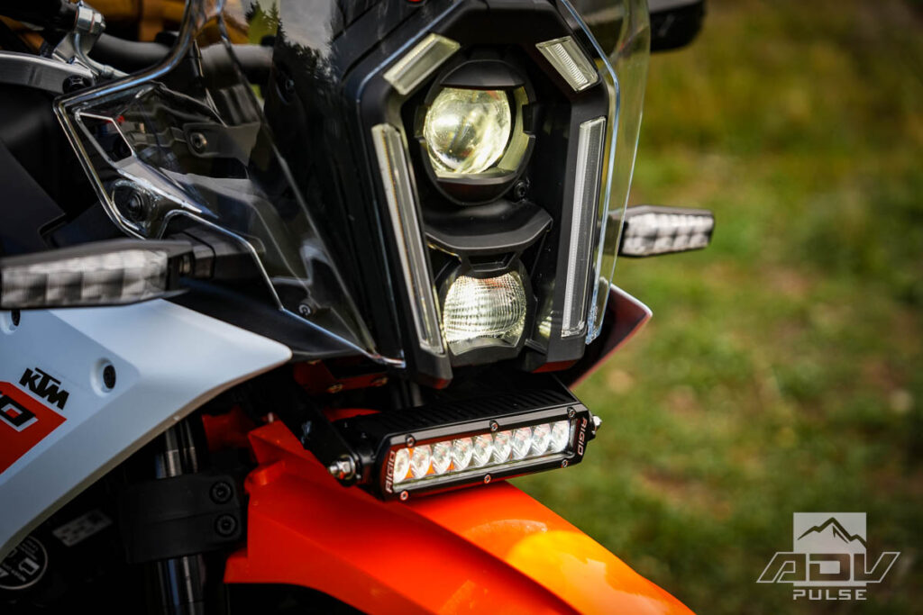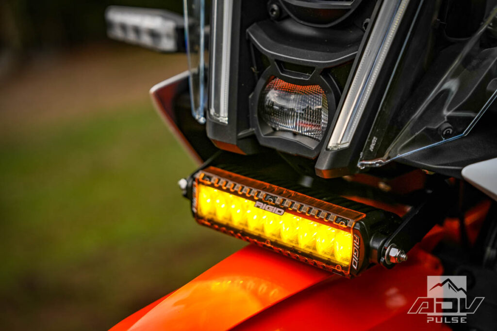 Night riding is often unavoidable on multi‑day trips, and while the stock LED headlight is decent, it falls short of the powerful illumination an auxiliary light provides. BDCW added a Rigid Industries 6‑inch LED lightbar, available in both SAE‑approved and Pro versions. The SAE model allows you to legally run it at night on the road without blinding oncoming traffic, while the Pro light is simply too bright to use around traffic but for off‑road or backcountry riding it turns night into day. The unit tucks neatly under the headlight, keeping it protected from damage in a fall, and comes with an amber clip‑on lens that improves visibility in fog while also making the bike more noticeable to cars on the road. MSRP $421.00