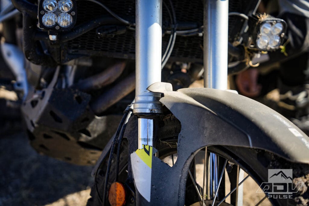 We soon noticed there was something wrong with his Aprilia Tuareg 660 though. While going through the creek, a slightly loose chain had picked up some plant material in the rear sprocket, which pushed the chain off, causing Carlos to lose momentum and suddenly fall over. We quickly got to work pulling out the tools to get the chain back on when we noticed another problem. The upper fork leg looked like it had been hit by a bullet, right where the fork seal sits. Throughout much of the day he had been riding slightly staggered behind me, trying to stay ahead of the dust. My bike must have kicked up a rock. We’ve ridden like this for countless miles over the years and this is the first time I’ve seen this happen. Oil was beginning to ooze out of the fork leg but it seemed like a slow leak, so we kept on.