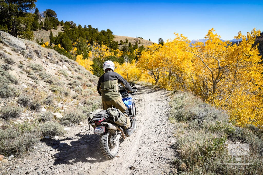 I recruited a few friends for this trip and we made the two-day trek from Southern California, eager to sample some of Idaho’s best terrain. I’ve been to the state to ride a few times but never this particular area. I’d heard it has a diversity of terrain to explore — alpine forest, high desert, 10,000‑foot passes, and technical single‑track. Whether you’re on a big GS or 2-stroke 300, there’s something for everyone. And since we’d be heading there in the early fall, that meant fall colors too.