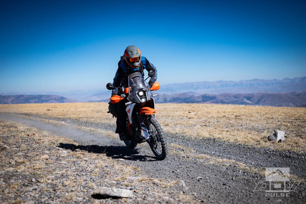 We took off to catch up to Kurt’s group, bypassing the first short dirt section to make up time. From the road, I could see a line of bikes kicking up dust, which didn’t look like much fun for those in the back. Everyone wants to ride together but sometimes it’s best to split up into smaller groups. After catching them at the next turn, it was clear that this was too big of a group to ride in, so we held back a bit and took a few photos, then would catch up every so often on the route. At some point, they went off the track and we lost the group though. Around this time, we got a signal and received a message from Tavo. It turned out he’d followed one of the many riders wearing the same orange Mosko outfit I was wearing at the gas station, thinking it was me. It wasn’t until the group of riders got on one of the “Red” technical single track with some gnarly whoops that he realized, “Wait, that guy is on a KTM 2-stroke dirt bike, not a 390 ADV R.” At that point he was already miles away in the opposite direction.